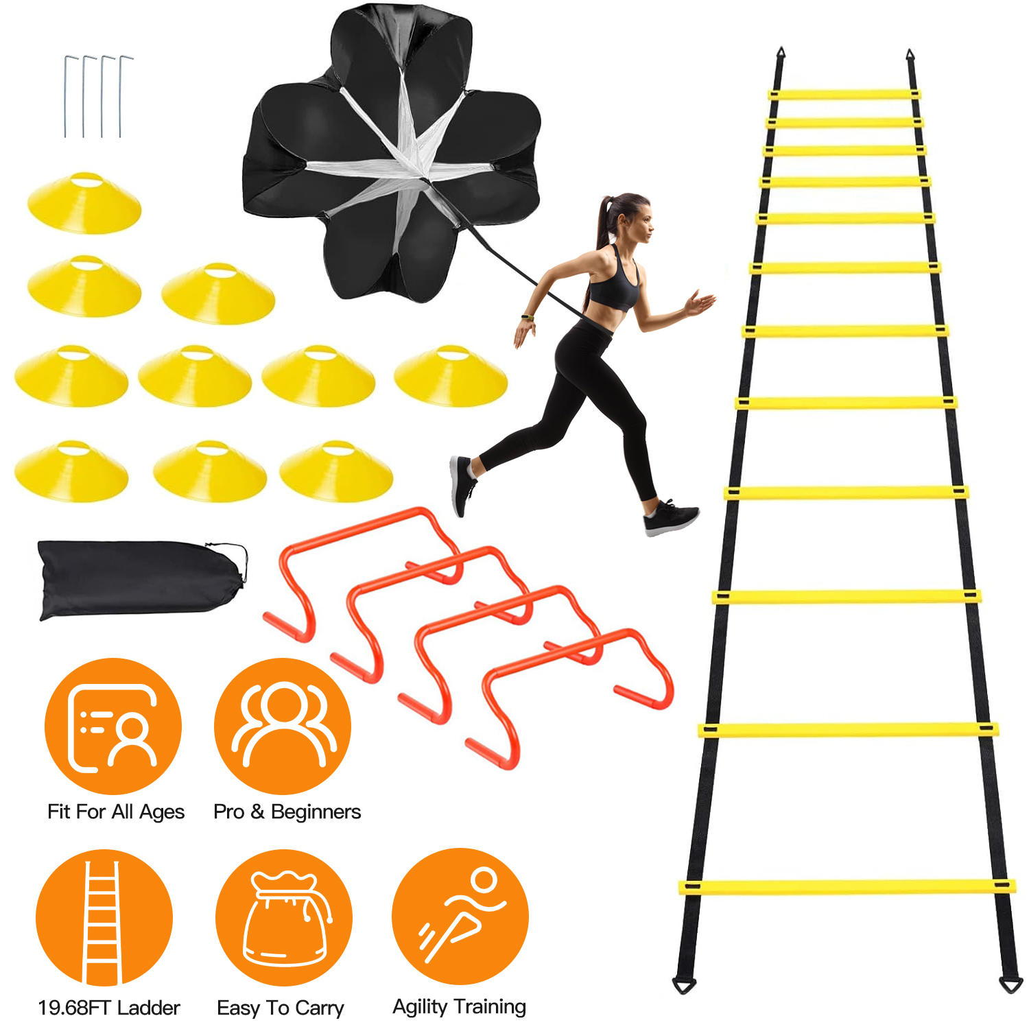 Home > Speed Agility Training Equipment Set For Pro Beginner Including Cones Parachute Stakes Hurdles 19.68FT Ladder with Carrying Bag Soccer Football Basket
